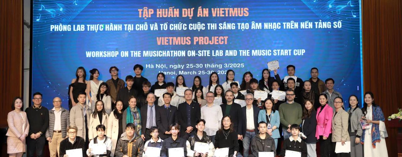De VIETMUS Musichathon, een innovatief laboratoriumevent, vond plaats in Hanoi, Vietnam, van 25 tot 30 maart 2025 en werd georganiseerd door de National University of Art Education (NUAE). Dit evenement verkende de praktische toepassing van digitale tools in muziekuitvoering op afstand en online onderwijs en bracht vertegenwoordigers samen van zes Vietnamese universiteiten en vier Europese instellingen.